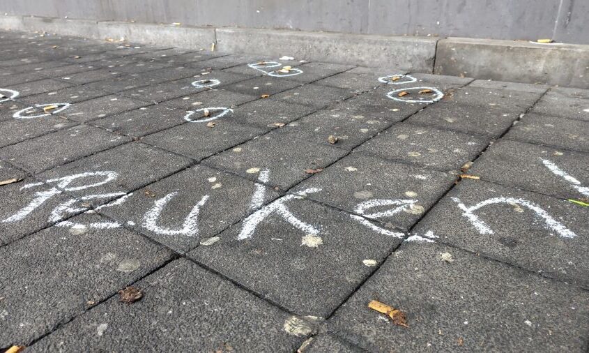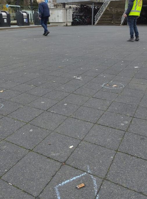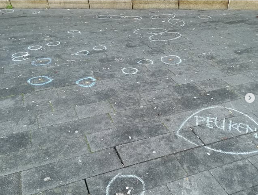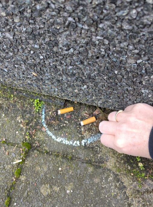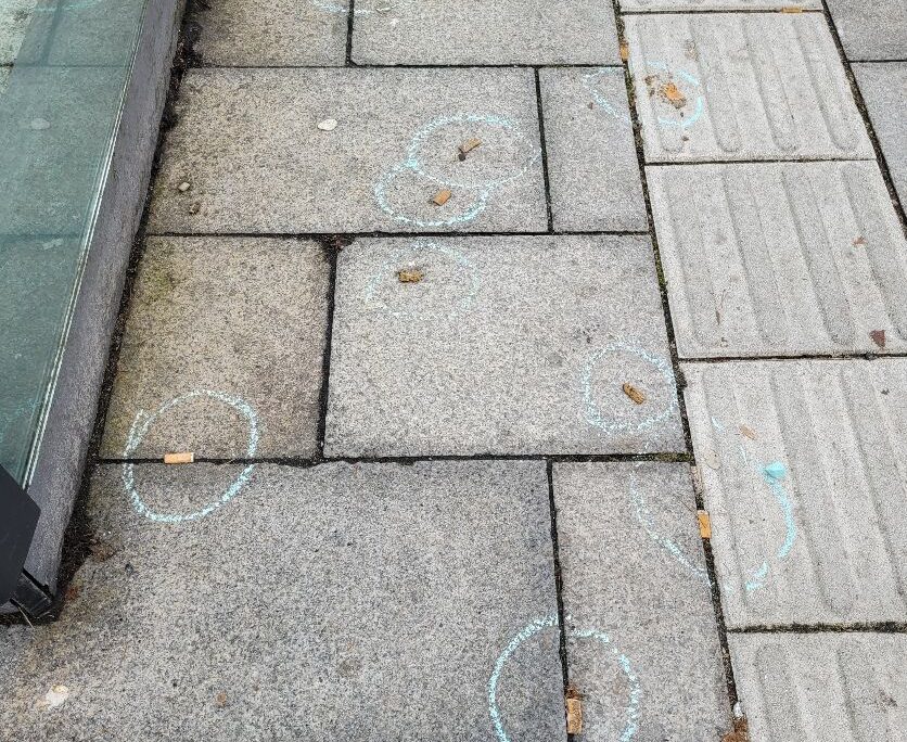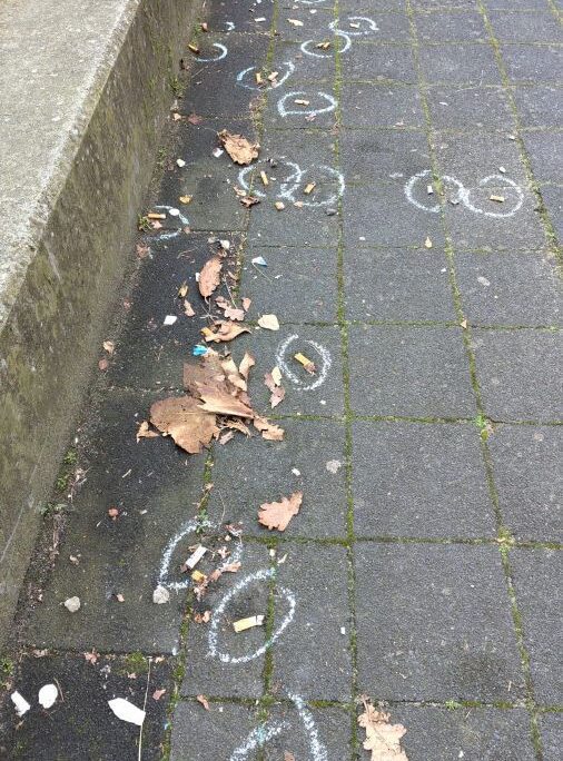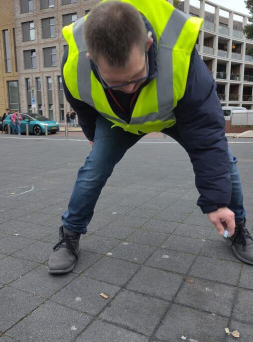 Het droge, windstille weer op dat moment zorgde ervoor dat het krijt goed bleef zitten. Peuken die vastzaten tussen de klinkers of platgetrapt waren, vielen perfect binnen de markeringen. Zo kon iedereen die middag op het Stationsplein deze ‘blauwe misdaadscènes’ zien en even stilstaan bij de impact van peuken op het milieu.