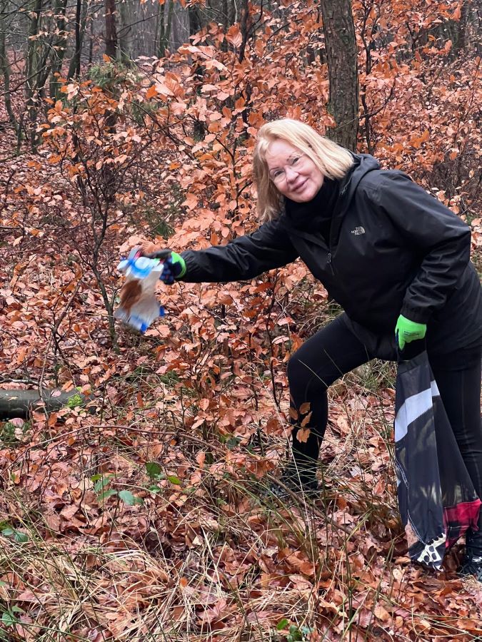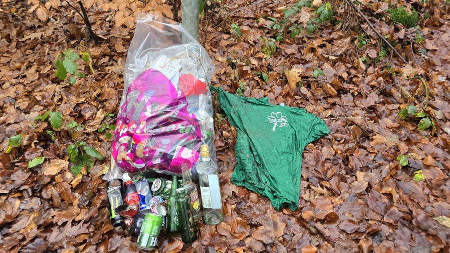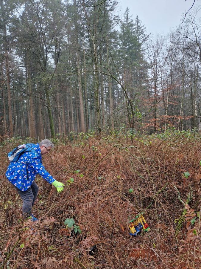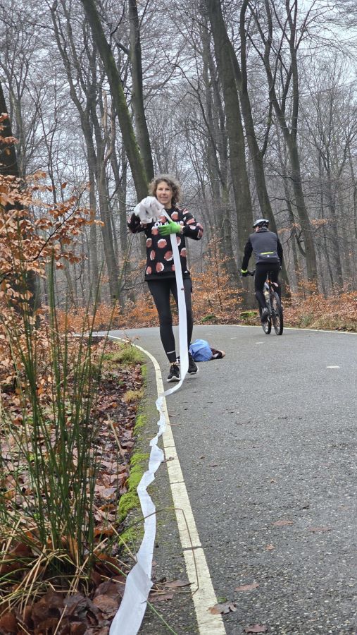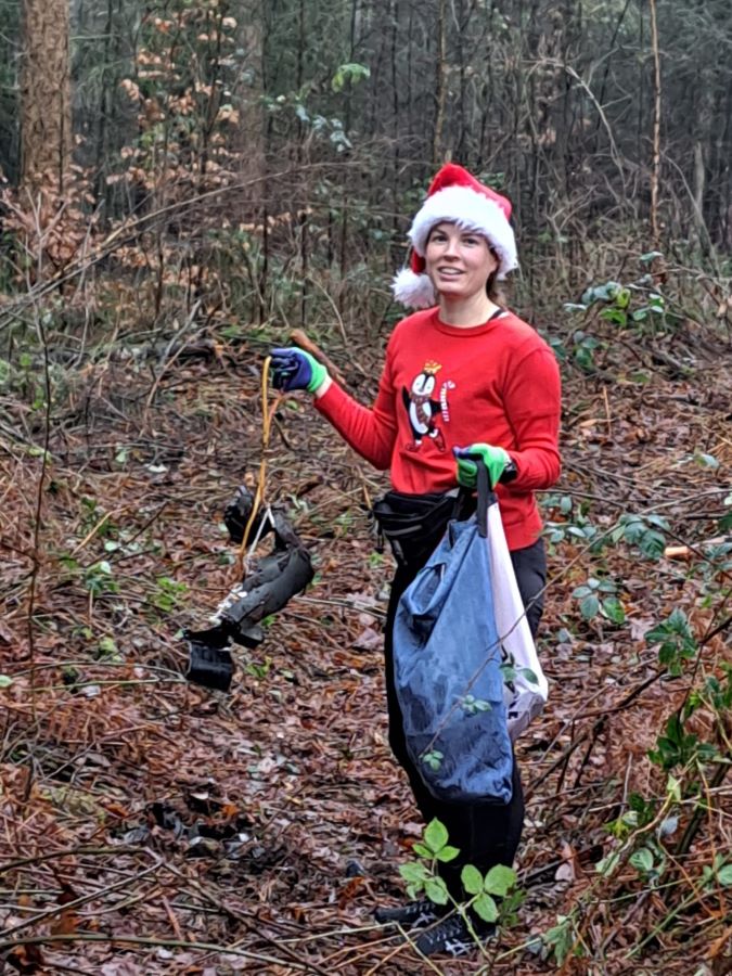 In kleine groepjes trokken de elfjes het bos in. Al snel werd duidelijk waarom ploggen ook hier nodig blijft. Tussen de dennen en langs de bospaden leek het alsof er ’s nachts mysterieuze boswezens hadden huisgehouden, met bier, koffie en sterke drank als brandstof, aangevuld met energiegels en bananen voor de snelle suikers. Het magische winterbos kreeg zo een minder sprookjesachtige bijnaam: het dronken bos 🥴