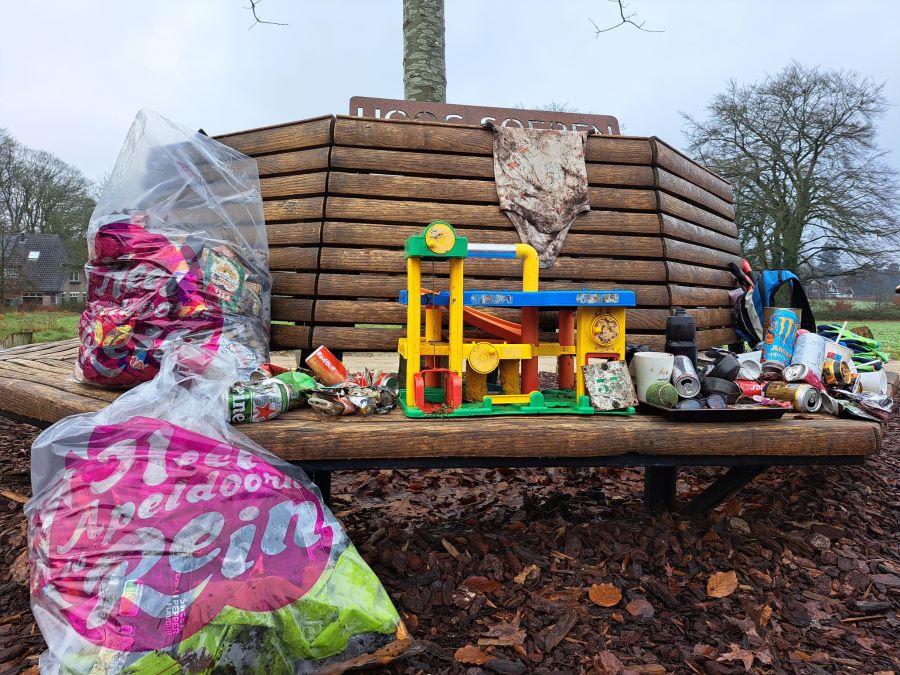 Gelukkig kwamen de Zero Waste Apeldoorn ploggers precies op tijd. Met een scherp oog werd alles zorgvuldig opgeraapt: van blikjes en lege flessen tot snackverpakkingen, kleding, doekjes en ander los plastic. En alsof dat nog niet genoeg was, kwamen ook opvallende vondsten voorbij — een speelgoedgarage, een koffiezetmachine en andere onverwachte achterblijvers langs de route.