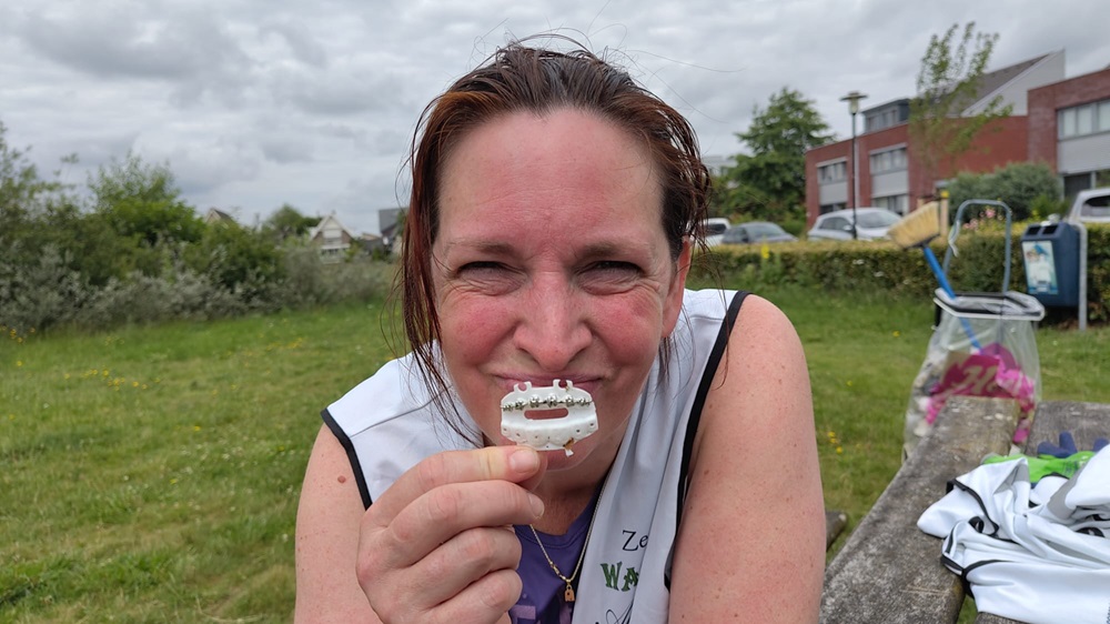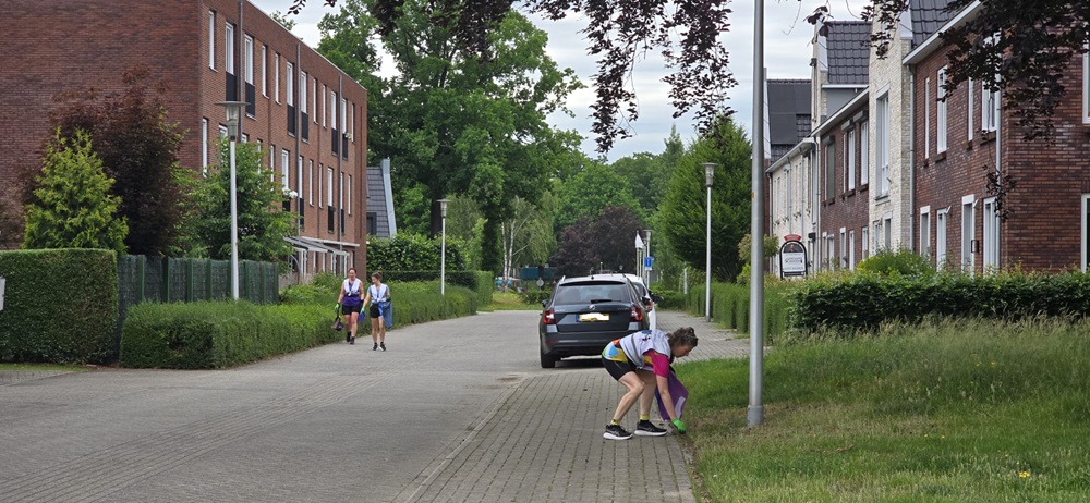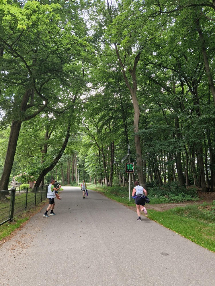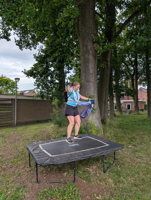 Tijdens diezelfde plogrun met Paul kwamen we toevallig Sandra tegen onderweg naar Paleis Het Loo. En daarna nog eens. En nóg eens. We plogden langs het fietspad, met steeds weer een stop om afval te rapen, terwijl Sandra in een steady wandeltempo op de stoep liep. Zo passeerden we elkaar om de paar minuten – dat schept een band! Haar nieuwsgierigheid groeide, haar glimlach werd groter, en voor we het wisten had ook zij zich aangesloten bij de ploggende crew*. 🙌