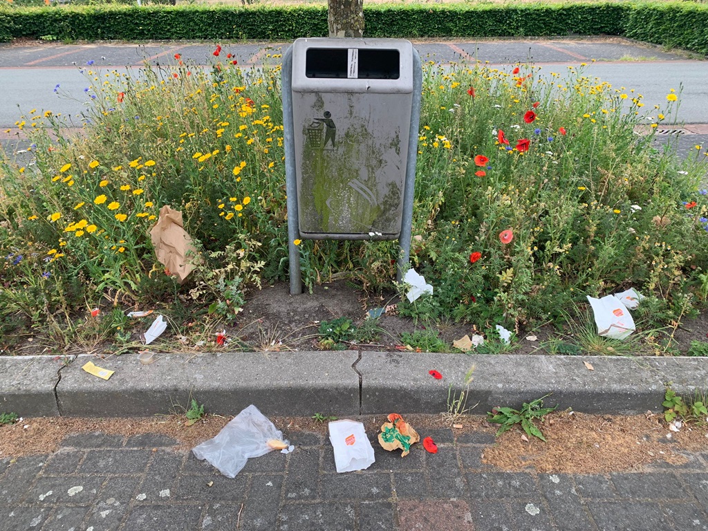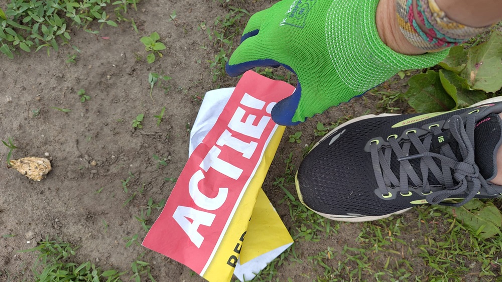 In totaal verzamelden we maar liefst zes zakken zwerfafval. De oogst was zoals altijd een mix van voorspelbaar (peuken, snoepverpakkingen,… ) en verrassend: een koekenpan, een handvol tuinlampjes, een bloempotornament, en liefst vier eenzame sokken. Tijd voor een nieuwe versie van WeZijnEenPaar.nl – maar dan voor sokken? 😄