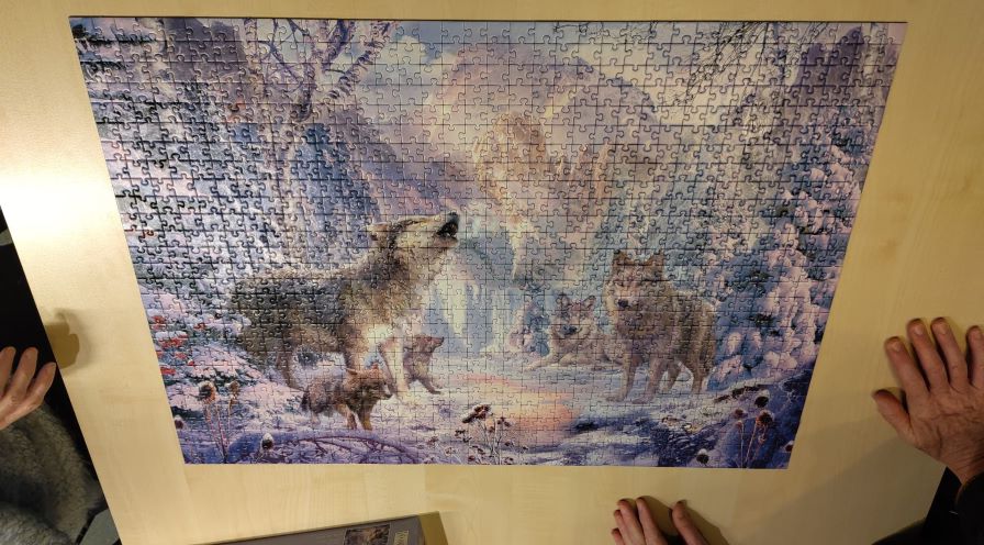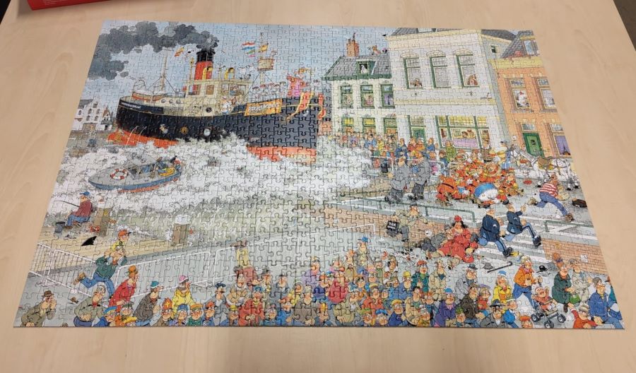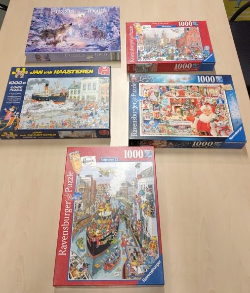 Vier puzzels van duizend stukjes lagen te wachten,