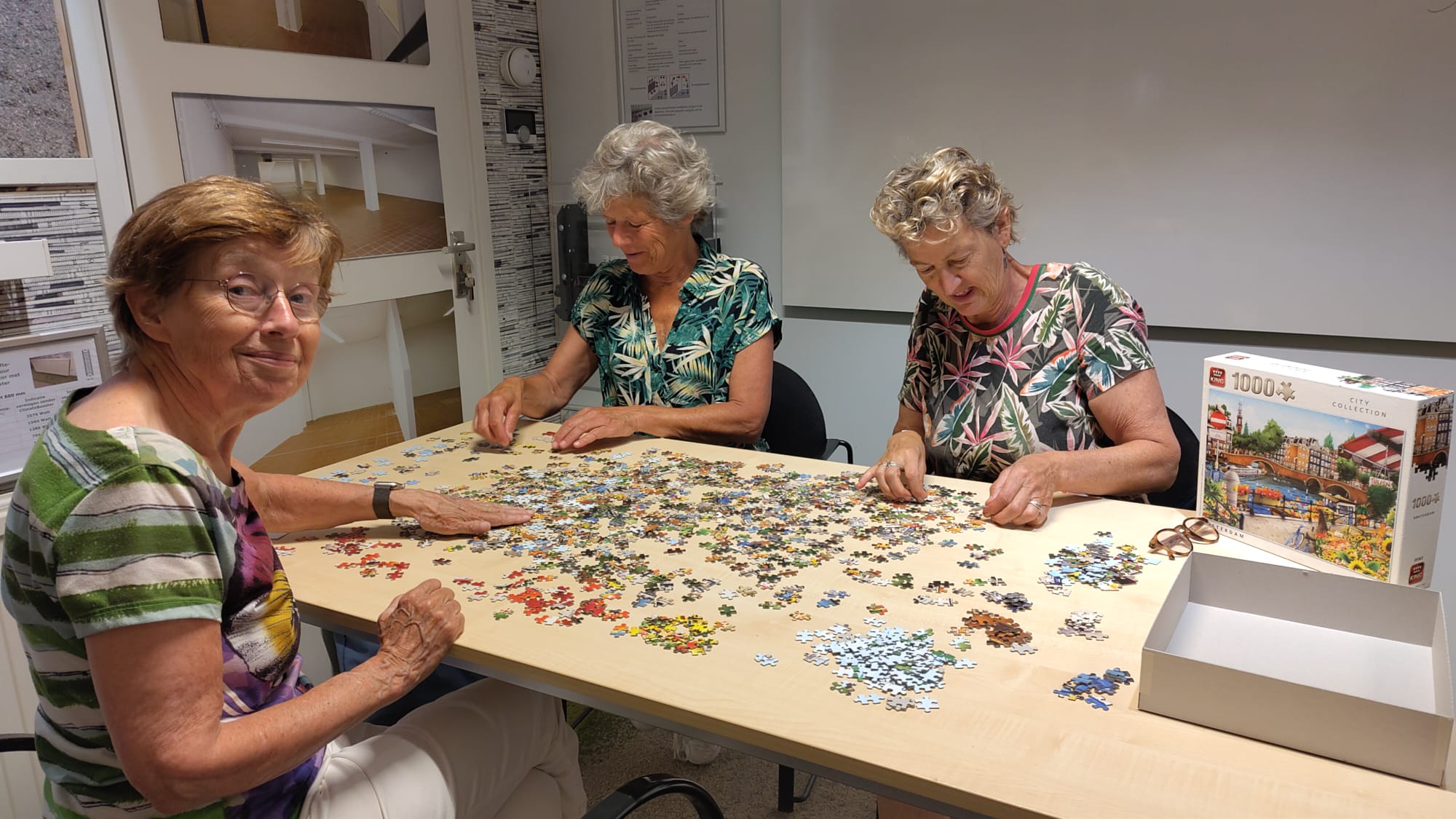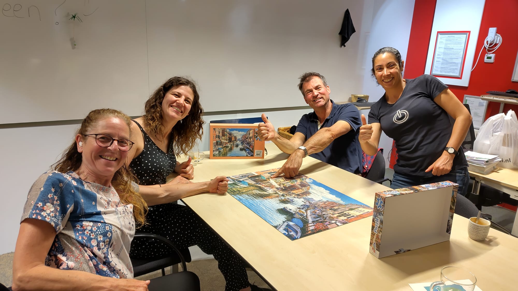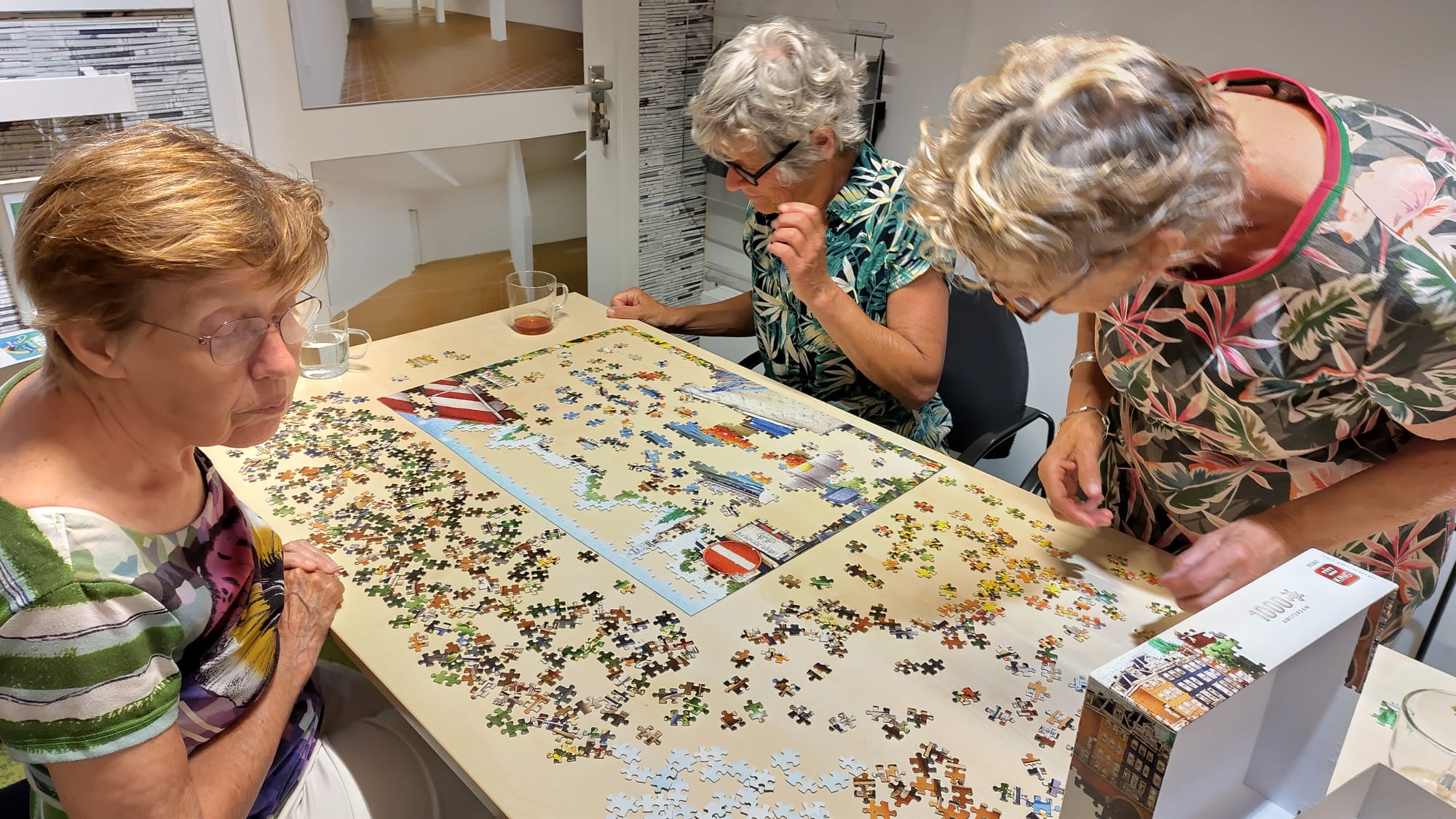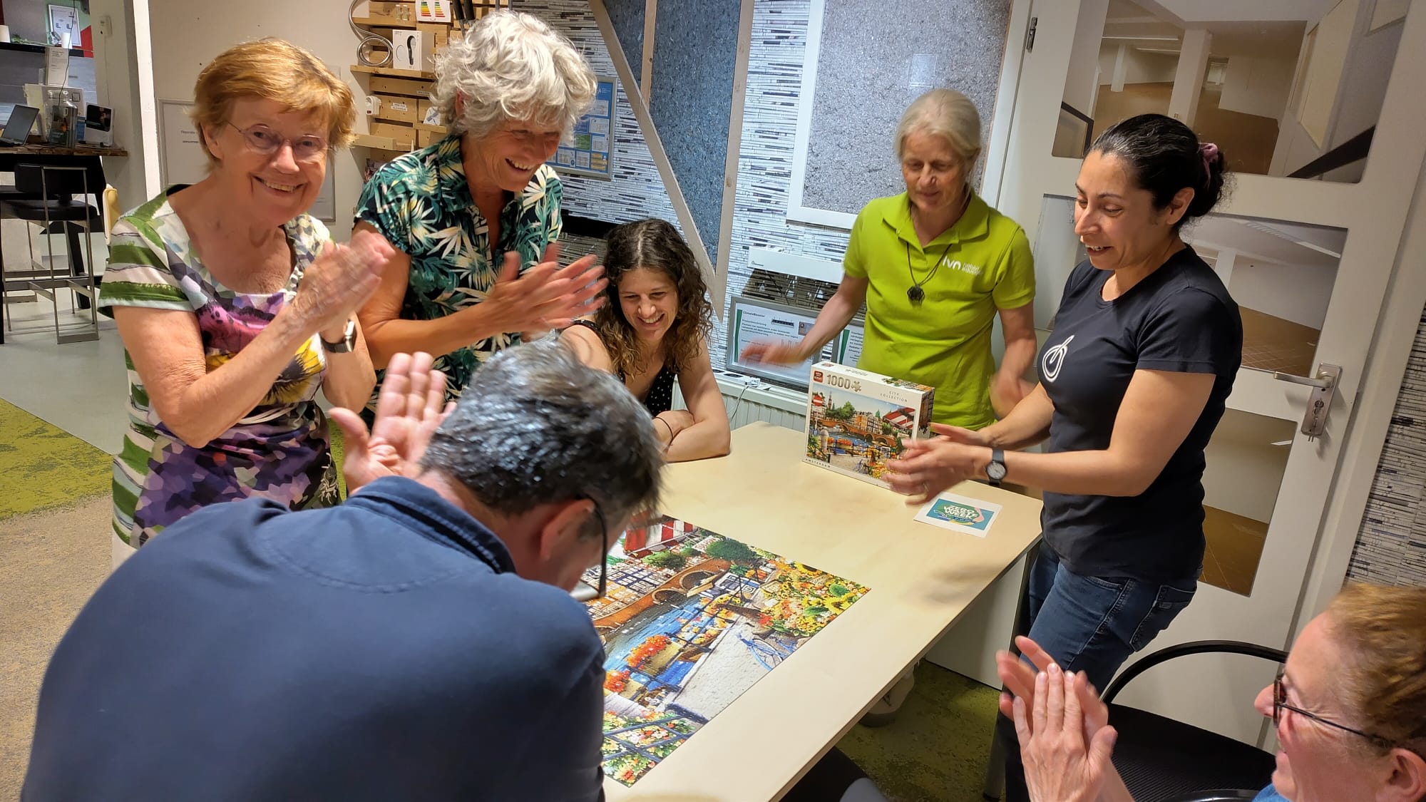 Toch kwamen ze ver – en op het laatst sprongen er spontaan extra handen bij! Tot zeven mensen bogen zich over de puzzel, wat voor veel vrolijke chaos zorgde. Er werd gelachen, geroepen, gewezen – maar vooral: genoten.