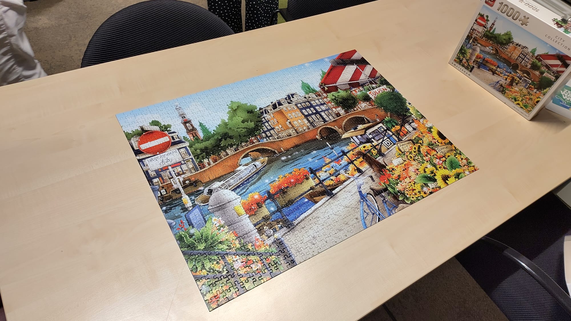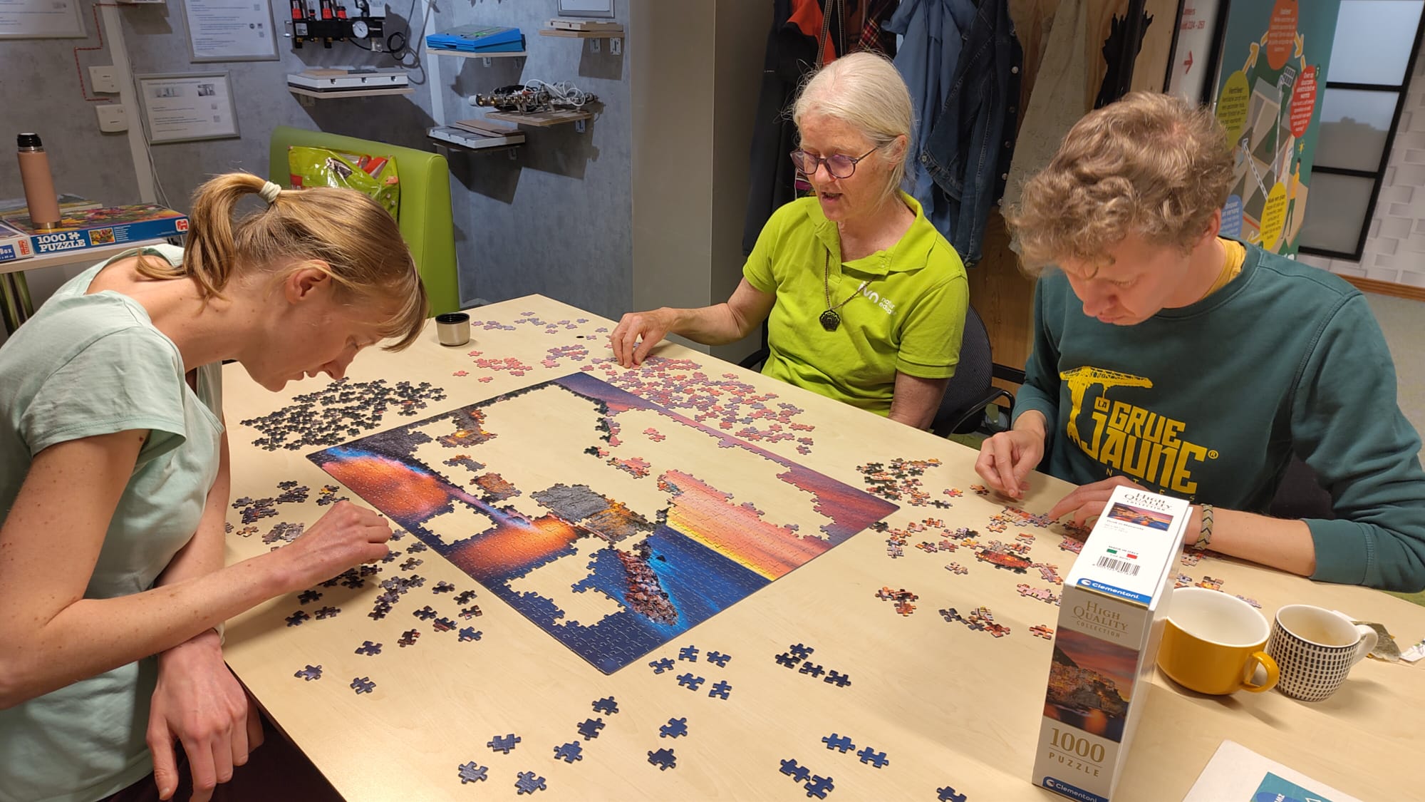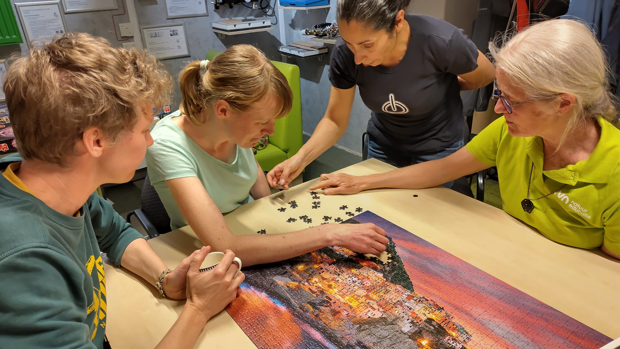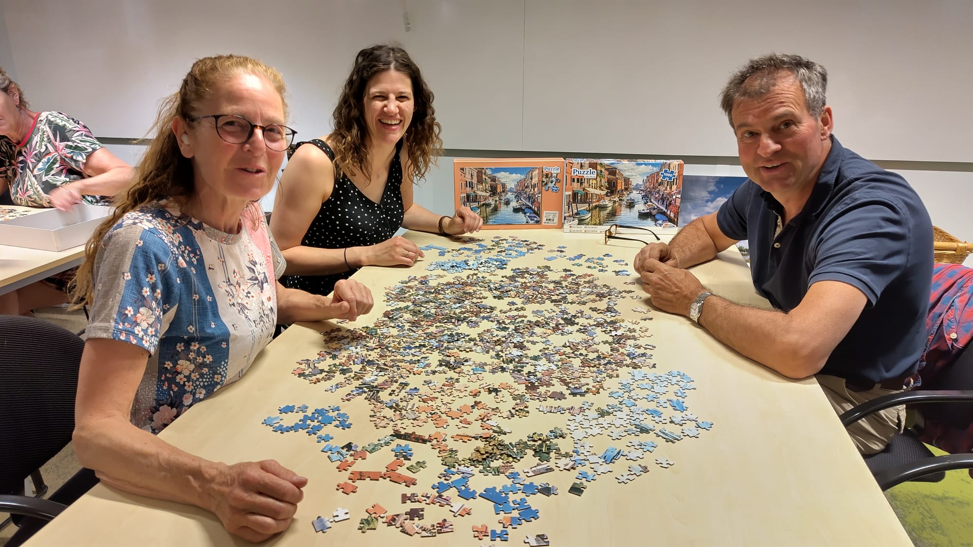 Toch kwamen ze ver – en op het laatst sprongen er spontaan extra handen bij! Tot zeven mensen bogen zich over de puzzel, wat voor veel vrolijke chaos zorgde. Er werd gelachen, geroepen, gewezen – maar vooral: genoten.