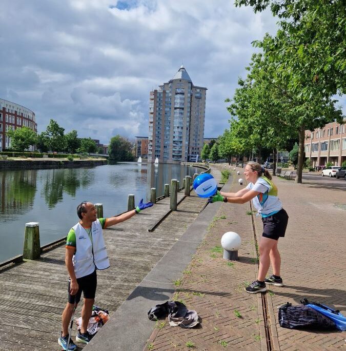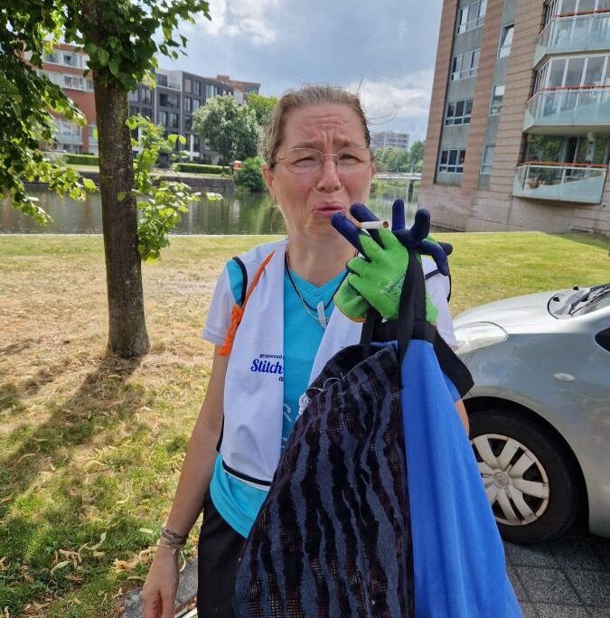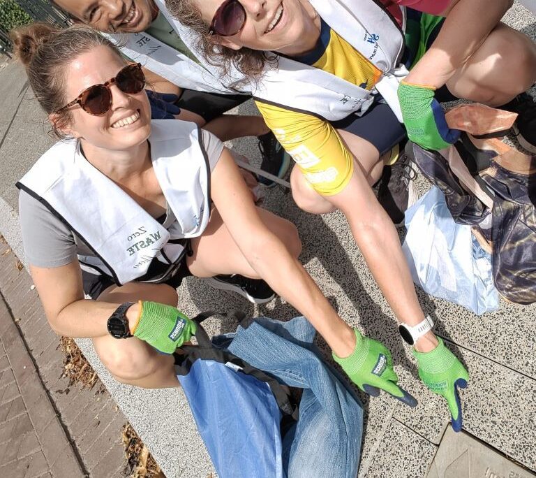 De handschoenen worden gewassen en krijgen een tweede leven via onze We zijn een paar-hub bij Impact Plek. Maar eerst bracht Wilma – die vandaag de meeste zwerf-handschoenen wist te verzamelen – ons op een ludiek idee: de bekende hardloopster aan de Loolaan (het beeld The Smile of Victory) tijdelijk aankleden met allerlei tijdens de plogrun gevonden kledingstukken én een Zero Waste Apeldoorn-hesje. Dat leverde een heerlijk en enig plaatje op!