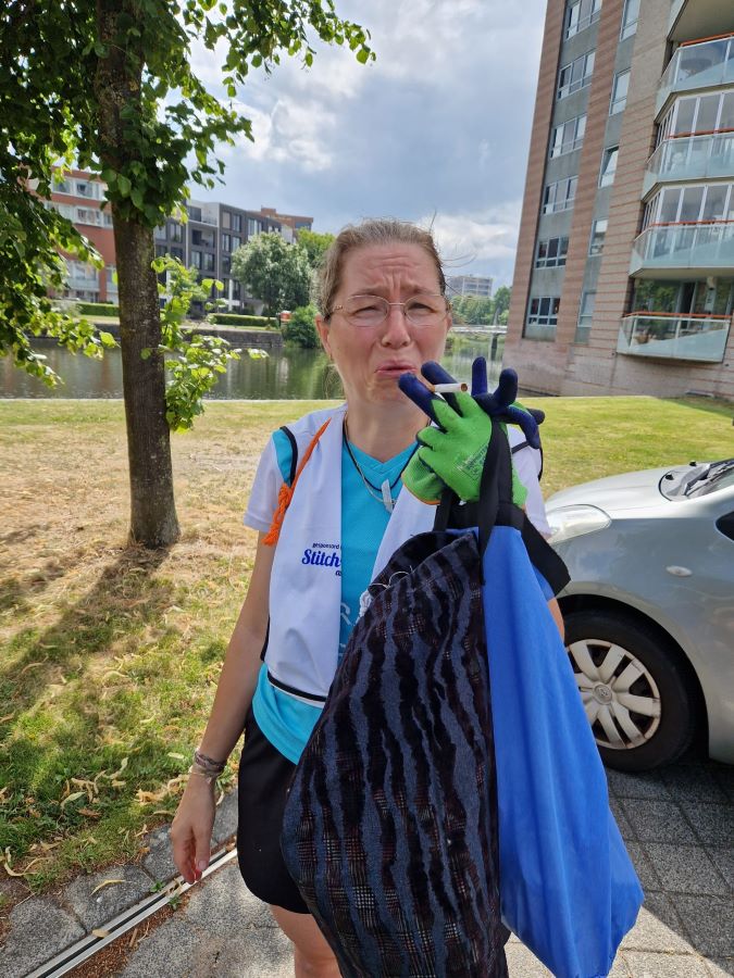 De handschoenen worden gewassen en krijgen een tweede leven via onze We zijn een paar-hub bij Impact Plek. Maar eerst bracht Wilma – die vandaag de meeste zwerf-handschoenen wist te verzamelen – ons op een ludiek idee: de bekende hardloopster aan de Loolaan (het beeld The Smile of Victory) tijdelijk aankleden met allerlei tijdens de plogrun gevonden kledingstukken én een Zero Waste Apeldoorn-hesje. Dat leverde een heerlijk en enig plaatje op!