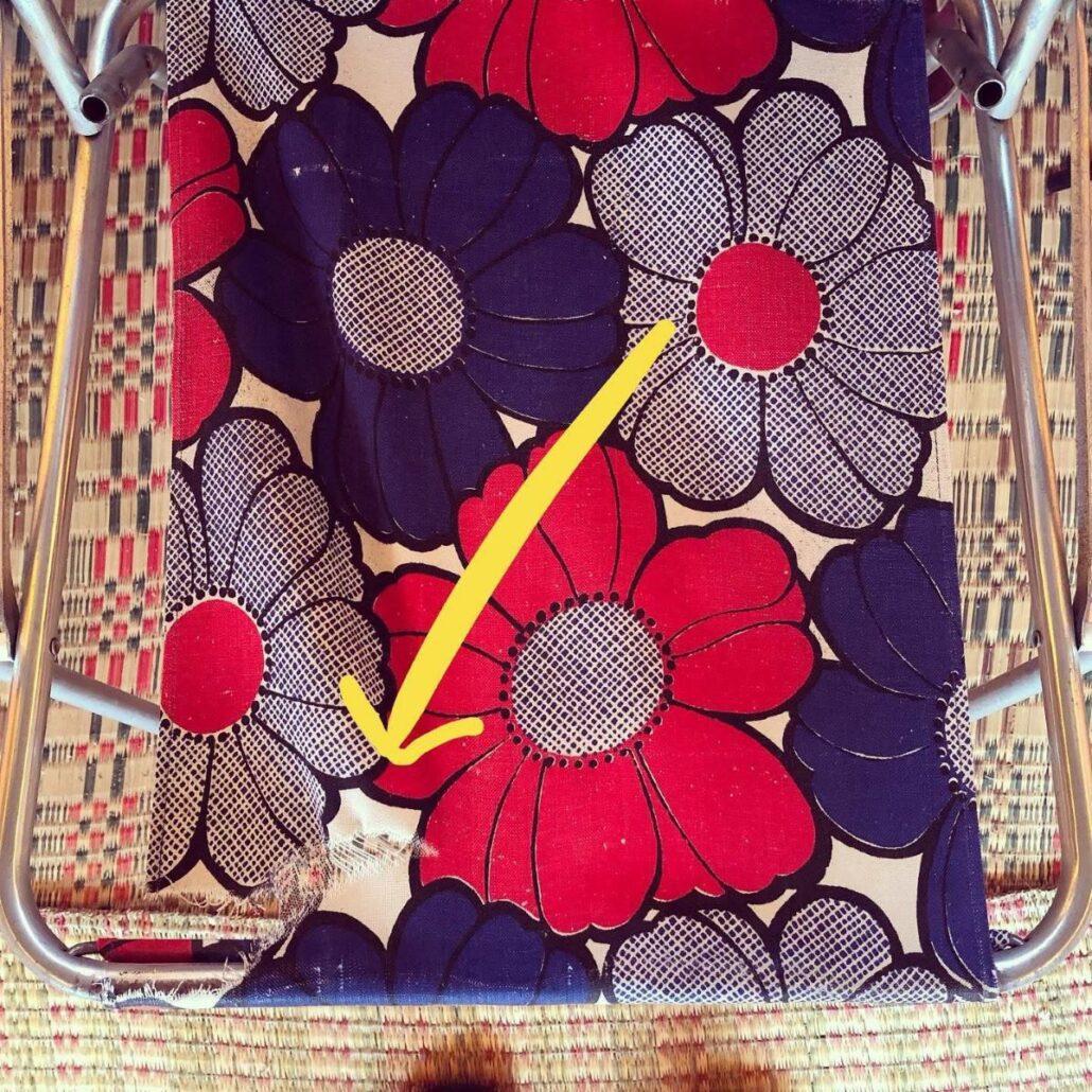 Zes jaar geleden scheurde onze vrolijke vintage bloemenstoel kapot op de camping. De stof was niet meer te redden, dus vonden we op een lokale brocante een waardige vervanger. Deze week ging onze zoon er iets té enthousiast op zitten… krak! Gelukkig scheurde de stof alleen op de naad.