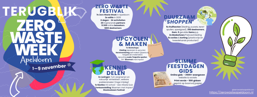 Met 24 activiteiten, honderden deelnemers, duizenden online bezoekers en een supersterk netwerk van partners kijken we terug op een fantastische 7e Zero Waste Winter in Apeldoorn. Samen lieten we zien dat circulair en zero waste leven niet ingewikkeld is — het is creatief, verbindend en verrassend leuk.