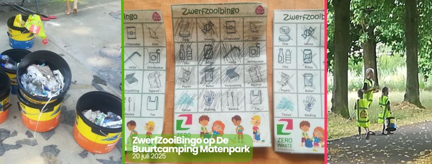 “Mevrouw, mogen we het ook met zijn tweeën of drieën doen?”, klonk al voor het begin. Nou zeker, want als 6-jarige kun je nooit een emmer, grijpstok, bingokaart en een potloodje tegelijk vasthouden. Enthousiast en gezellig keuvelend gingen de kinderen en volwassenen vervolgens in groepjes op pad. Heel serieus werd gezocht naar blikjes, peuken, rietjes, snoeppapiertjes en meer. En er lag genoeg.